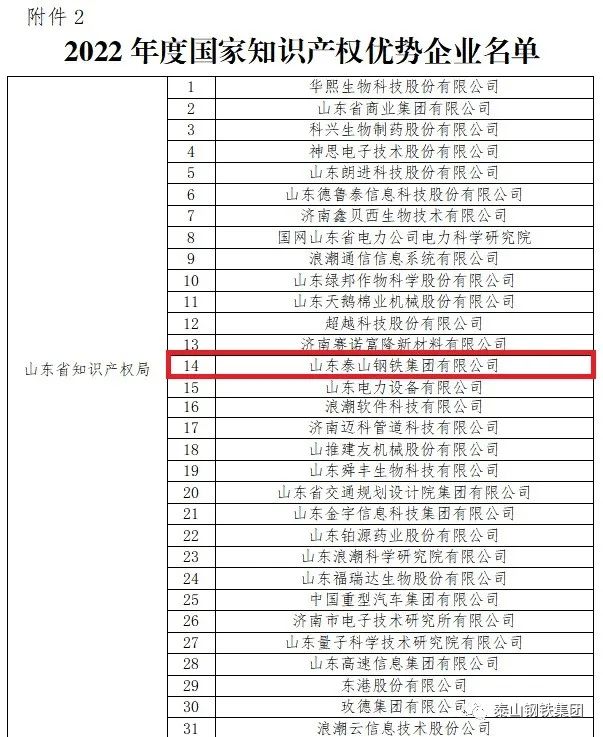 根据《国家知识产权局办公室关于面向企业开展2022年度知识产权强国建设示范工作的通知》要求,经企业测评、推荐上报、审核确认等程序,近日,国家知识产权局公布2022年度国家知识产权优势企业和示范企业名单,泰山钢铁集团上榜“国家知识产权优势企业”名单。