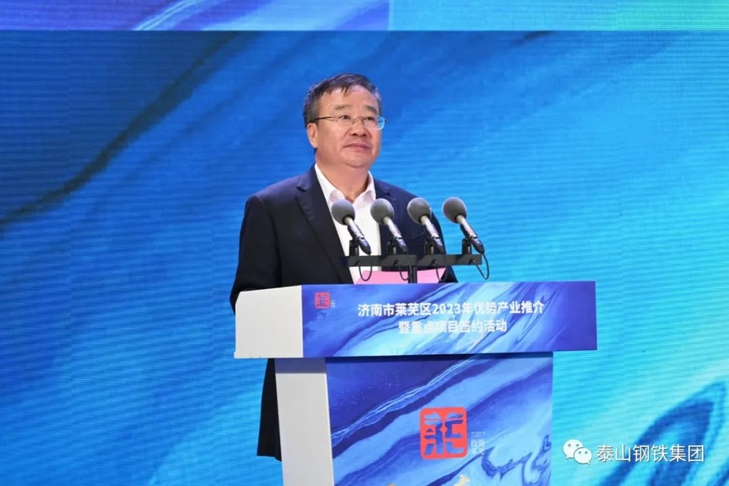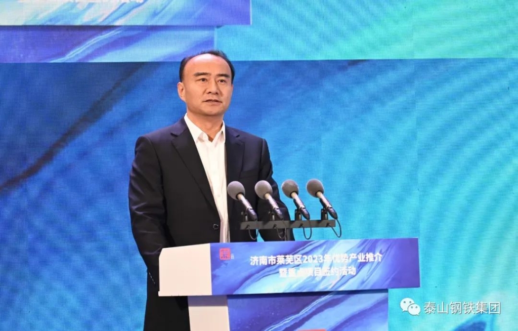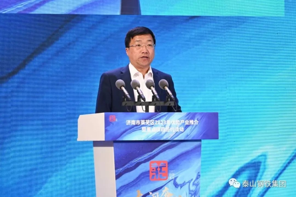 王董事长作为企业代表上台发言。他表示,作为一家莱芜的本土企业,泰山钢铁深刻感受着莱芜营商环境带来的便利,享受着这方创业发展热土的馈赠。今天的莱芜,“黄河流域先进制造业中心”布局纵深推进、“工业强区”战略深入实施、“项目突破年”强势开局,精品钢与先进材料、智能制造与高端装备、生物医药与大健康三大产业聚势成峰,一系列重大战略机遇的赋能助力,让莱芜站在了新时代的起点,拥有了无限广阔的发展前景,为各界朋友嘉宾在莱芜的发展提供更多、更好的选择。衷心期待与各位同仁携手共进,投资莱芜、兴业莱芜,同路相依,踔厉奋发,共同为现代化新莱芜建设贡献磅礴力量!