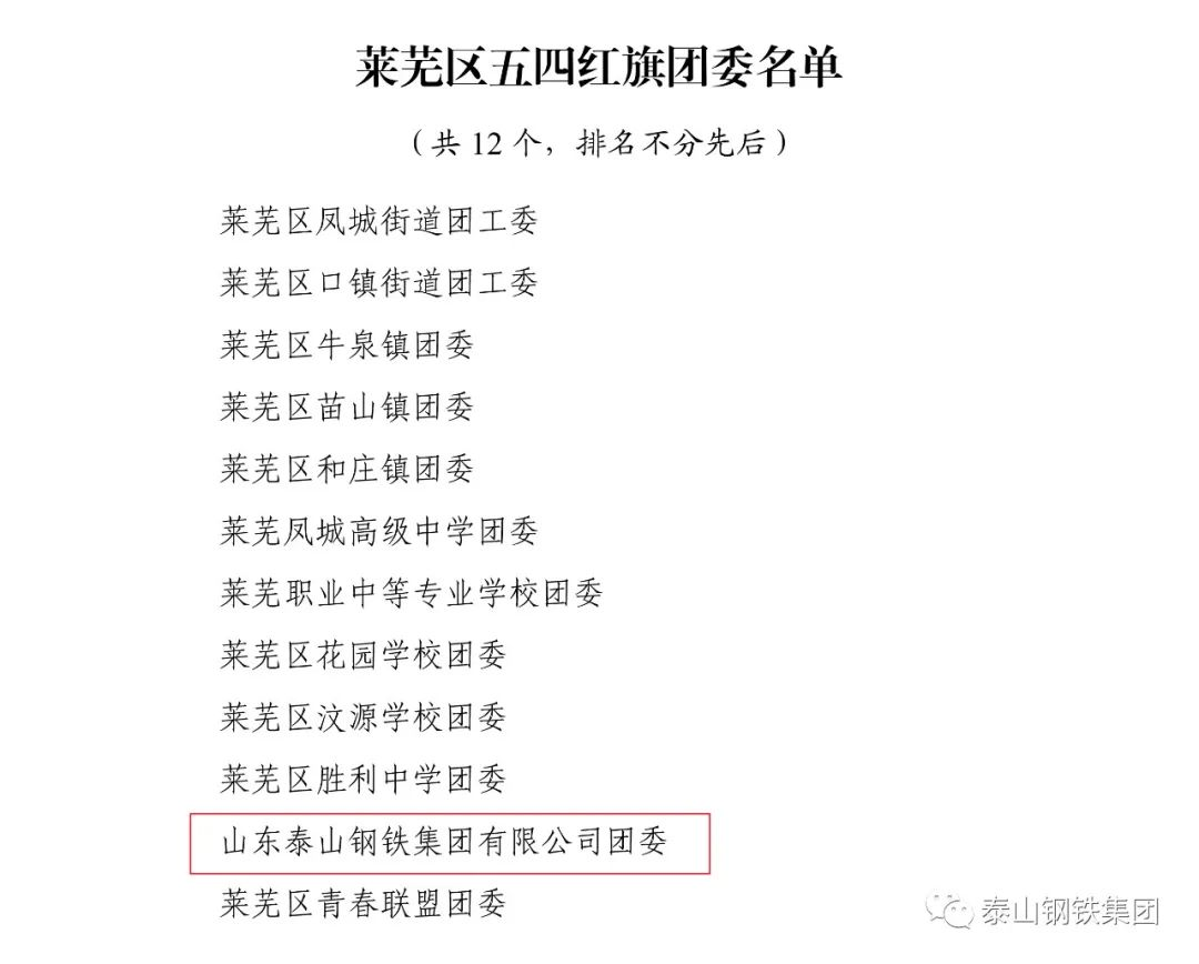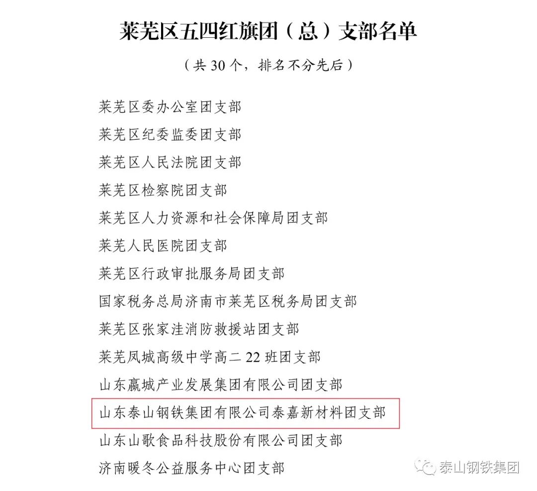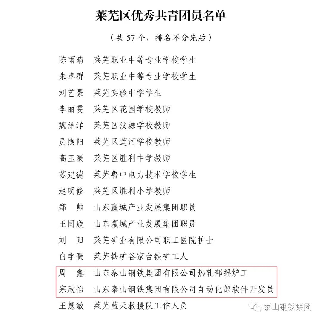 近日,共青团济南市莱芜区委下发文件《关于2022年度莱芜区五四典型的表扬通报》,表彰了一批先进单位和个人。其中,泰山钢铁集团团委上榜“莱芜区五四红旗团委”名单,泰嘉新材料团支部上榜“莱芜区五四红旗团(总)支部名单”,职工周鑫、宗欣怡上榜“莱芜区优秀共青团员名单”,职工李娟上榜“莱芜区优秀共青团干部名单”,职工亓敬坤、刘兆国被评为“莱芜区青年志愿者优秀个人”,众博(中国)青年志愿者服务队“打造幸福城市,送温暖进山村”志愿服务项目被评为“莱芜区青年志愿者优秀项目”。
