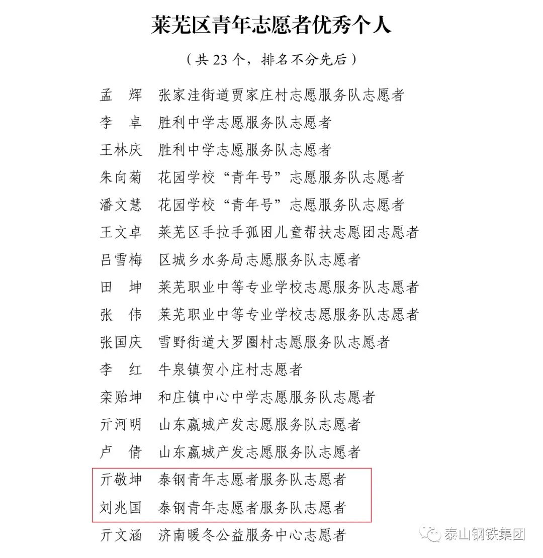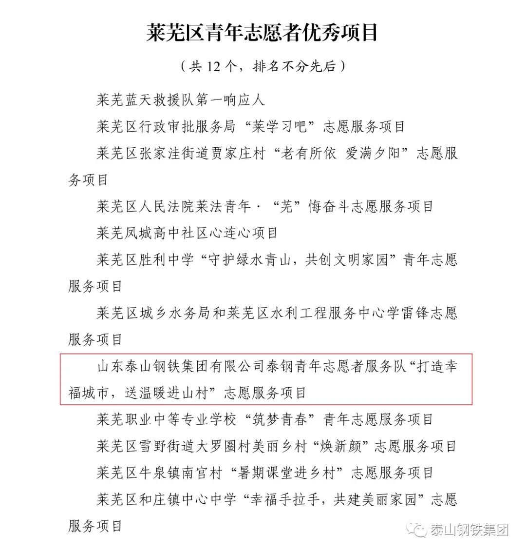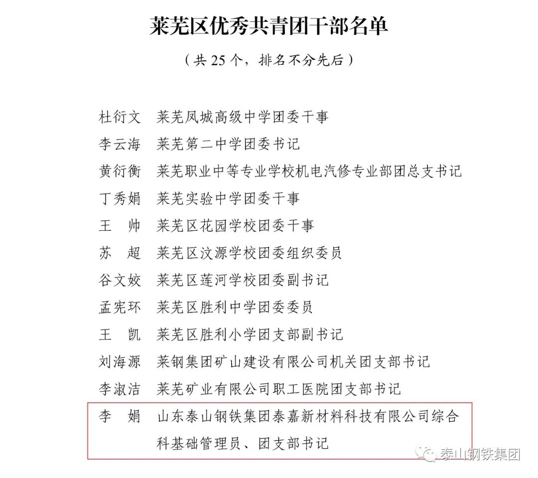 近日,共青团济南市莱芜区委下发文件《关于2022年度莱芜区五四典型的表扬通报》,表彰了一批先进单位和个人。其中,泰山钢铁集团团委上榜“莱芜区五四红旗团委”名单,泰嘉新材料团支部上榜“莱芜区五四红旗团(总)支部名单”,职工周鑫、宗欣怡上榜“莱芜区优秀共青团员名单”,职工李娟上榜“莱芜区优秀共青团干部名单”,职工亓敬坤、刘兆国被评为“莱芜区青年志愿者优秀个人”,众博(中国)青年志愿者服务队“打造幸福城市,送温暖进山村”志愿服务项目被评为“莱芜区青年志愿者优秀项目”。